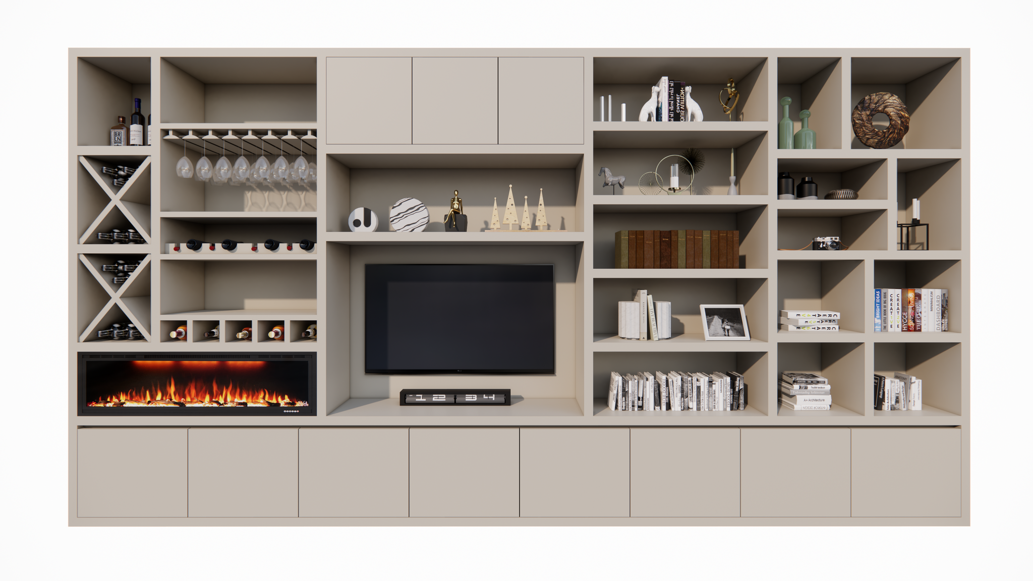 >Eine Besonderheit des Marle TV-Regalschrankes ist die Möglichkeit, einen Kamin einzubauen, der Ihrem Wohnzimmer sofort eine warme und gemütliche Atmosphäre verleiht. Dieser Kamin ist optional und kann nach Belieben hinzugefügt werden. Er ist nicht nur eine optische Bereicherung, sondern auch eine funktionale Ergänzung für alle, die eine besondere Atmosphäre in ihrem Zuhause wünschen. Sollten Sie keinen Kamin wünschen, können Sie den Schrank auch einfach ohne dieses zusätzliche Element anfertigen lassen.