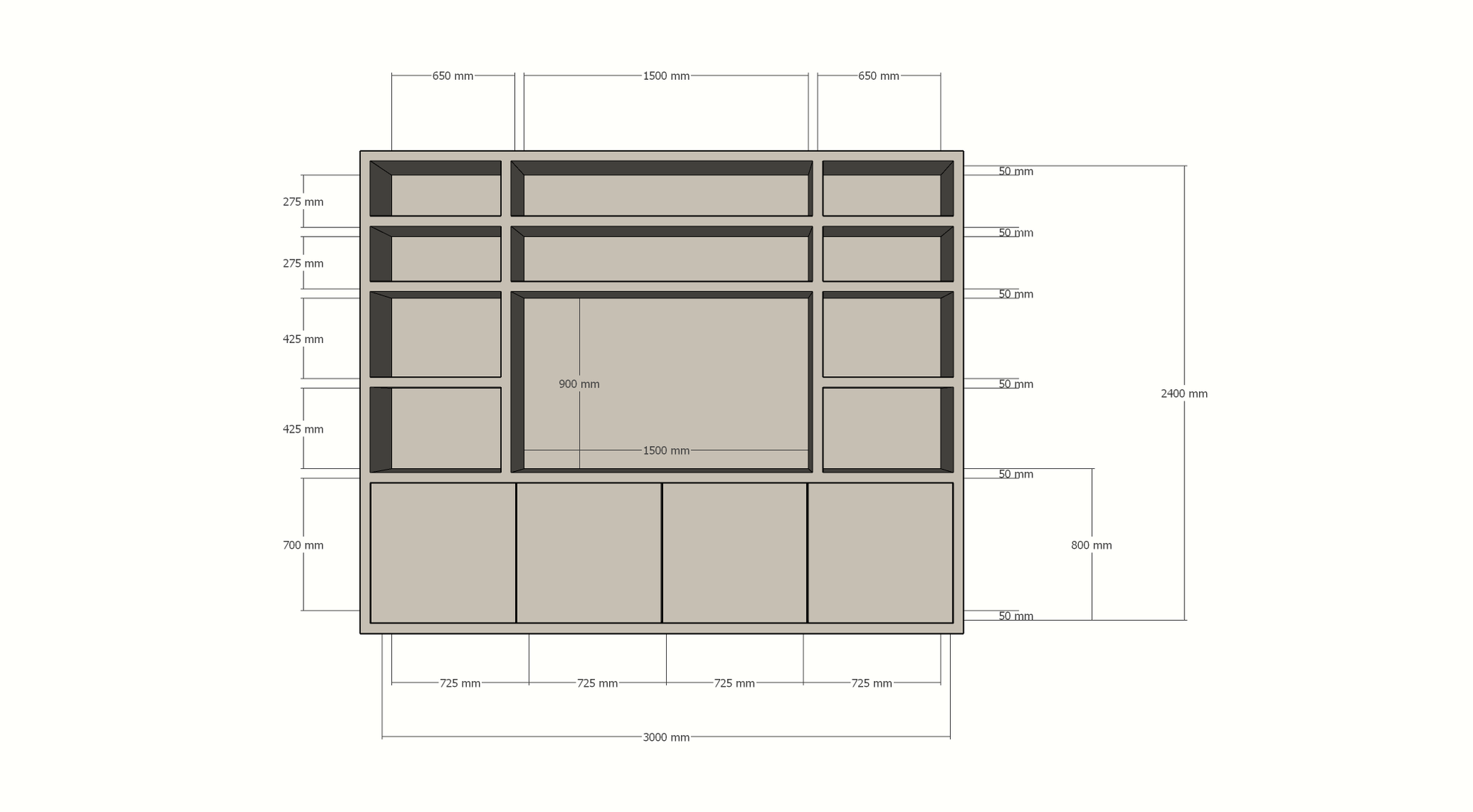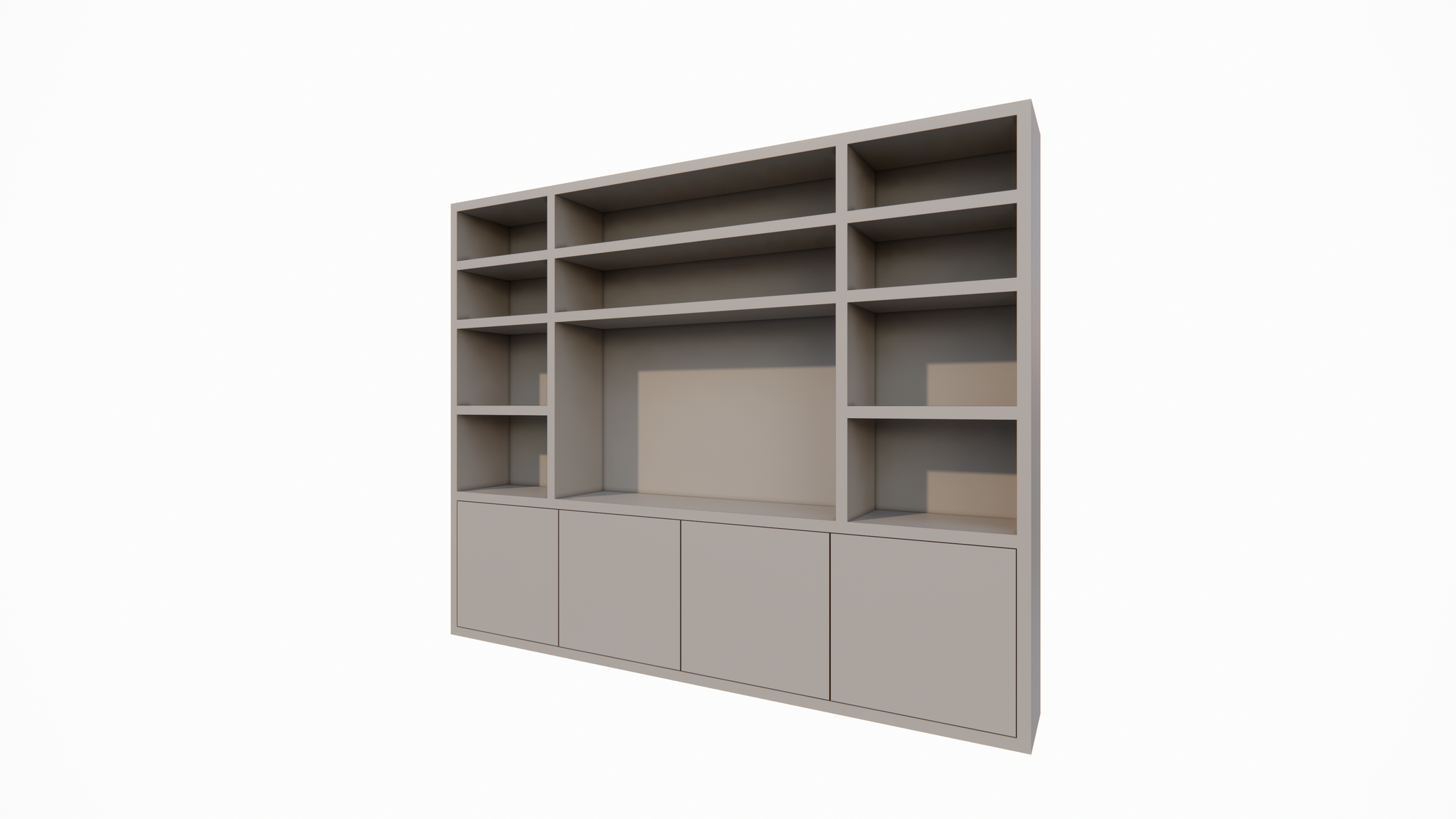 Hong Kong Fächerschrank - 300x40x240cm - 11 offene Fächer - 4 push-to-open Türen - 5cm Fachbodenstärke