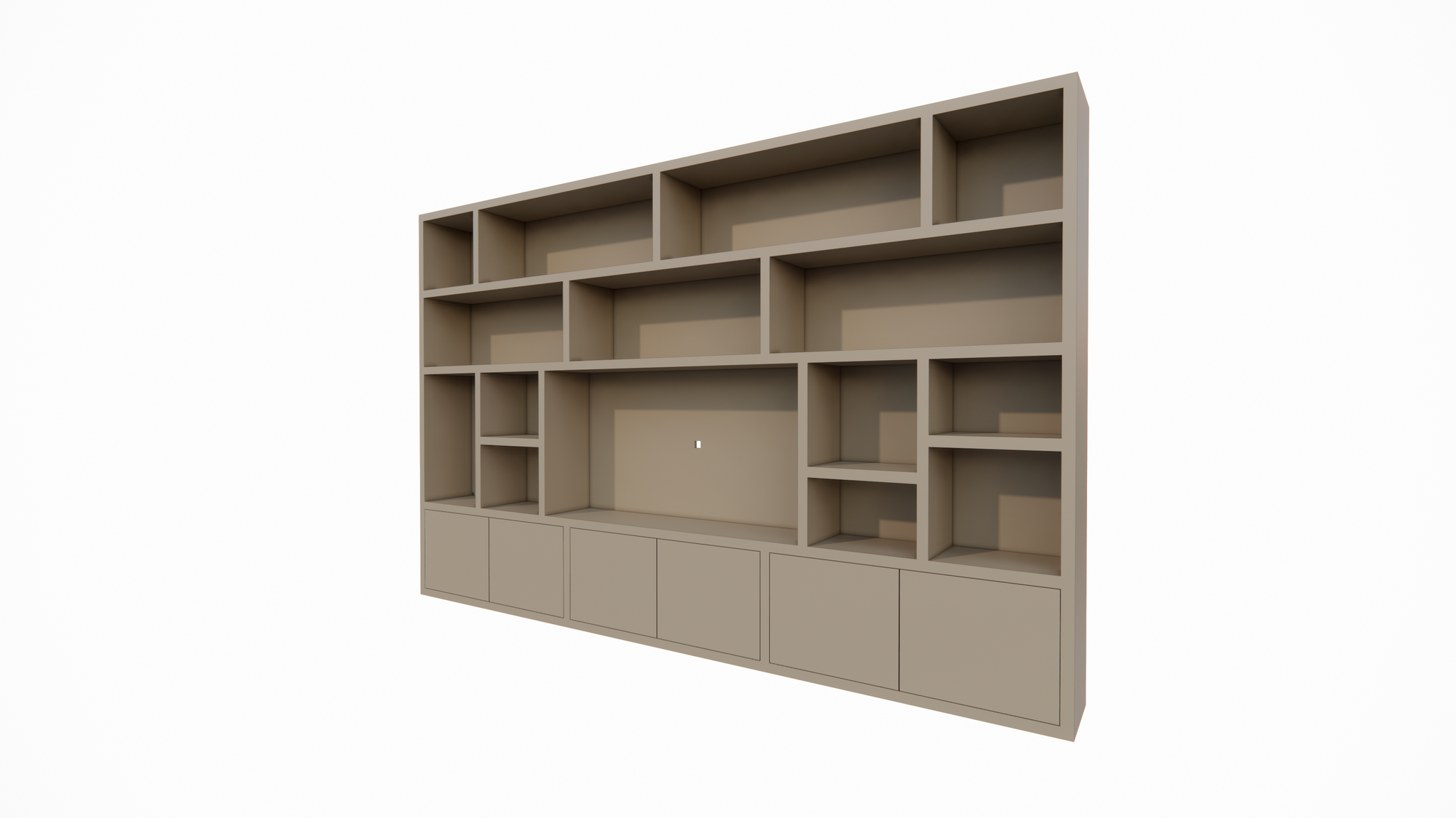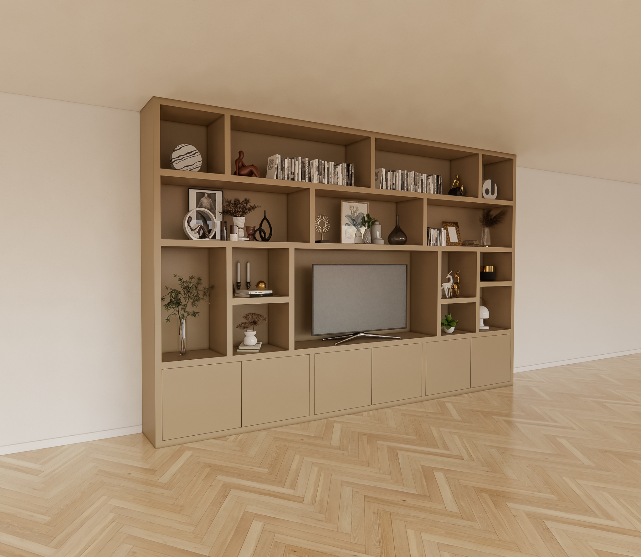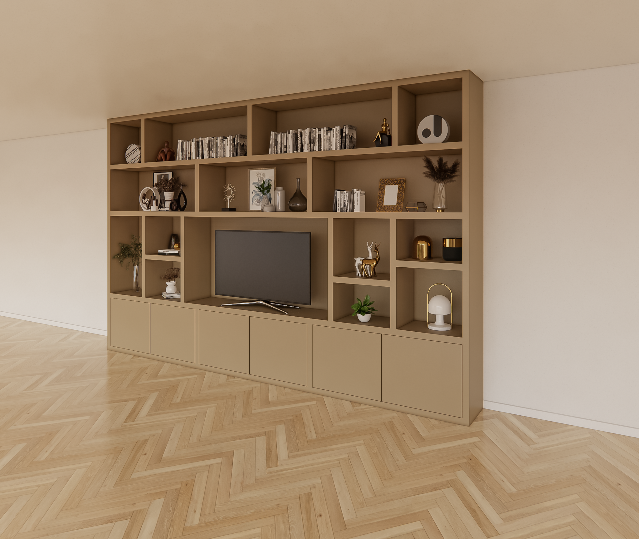 Osaka Fächerschrank - 400x40x255H cm - 15 offene Fächer - 6 push-to-open Türen - Cinewall - TV-Fach - schlankes Design - zerlegbar - 5cm Bodenstärke