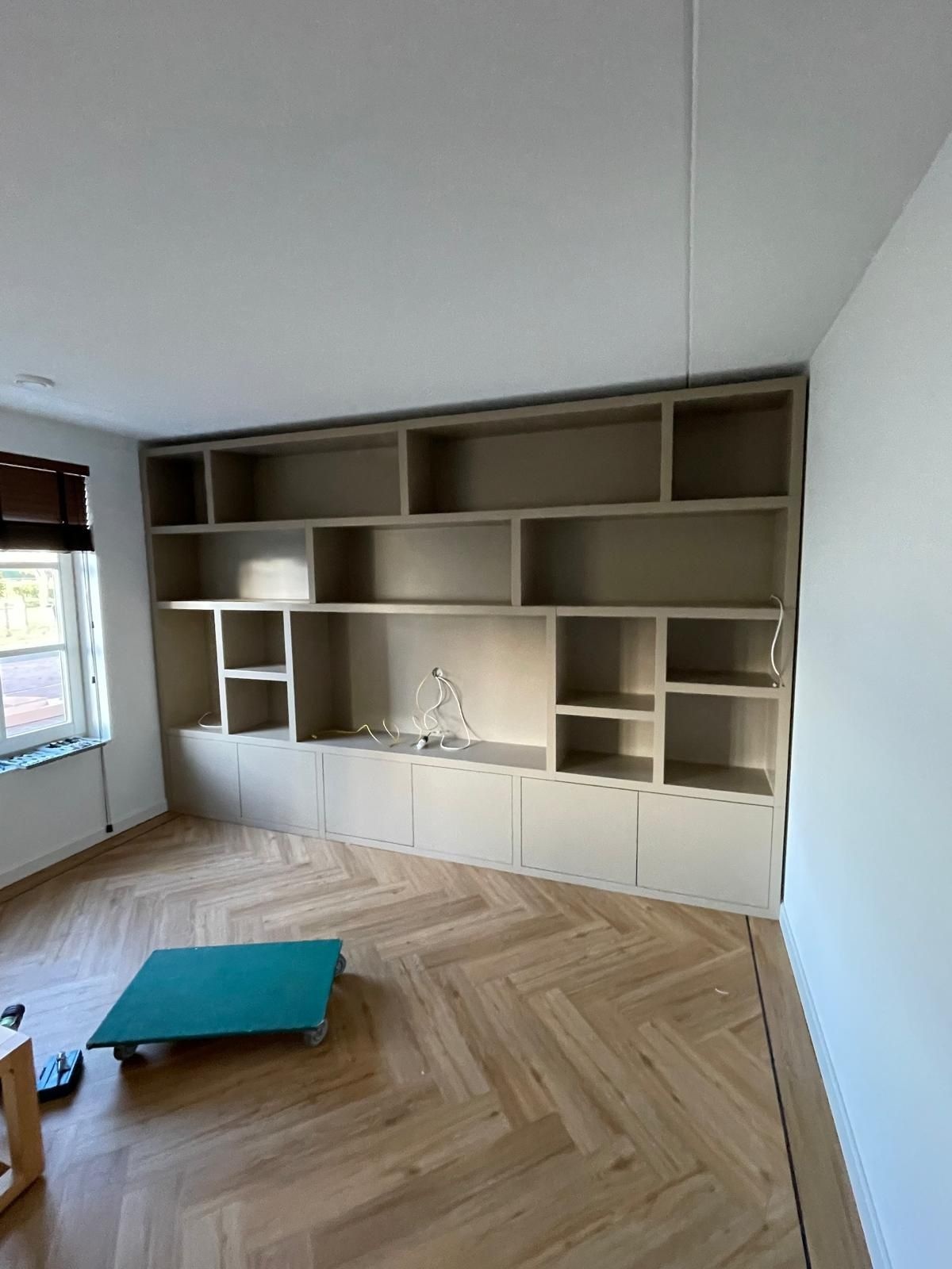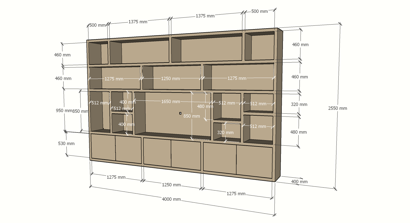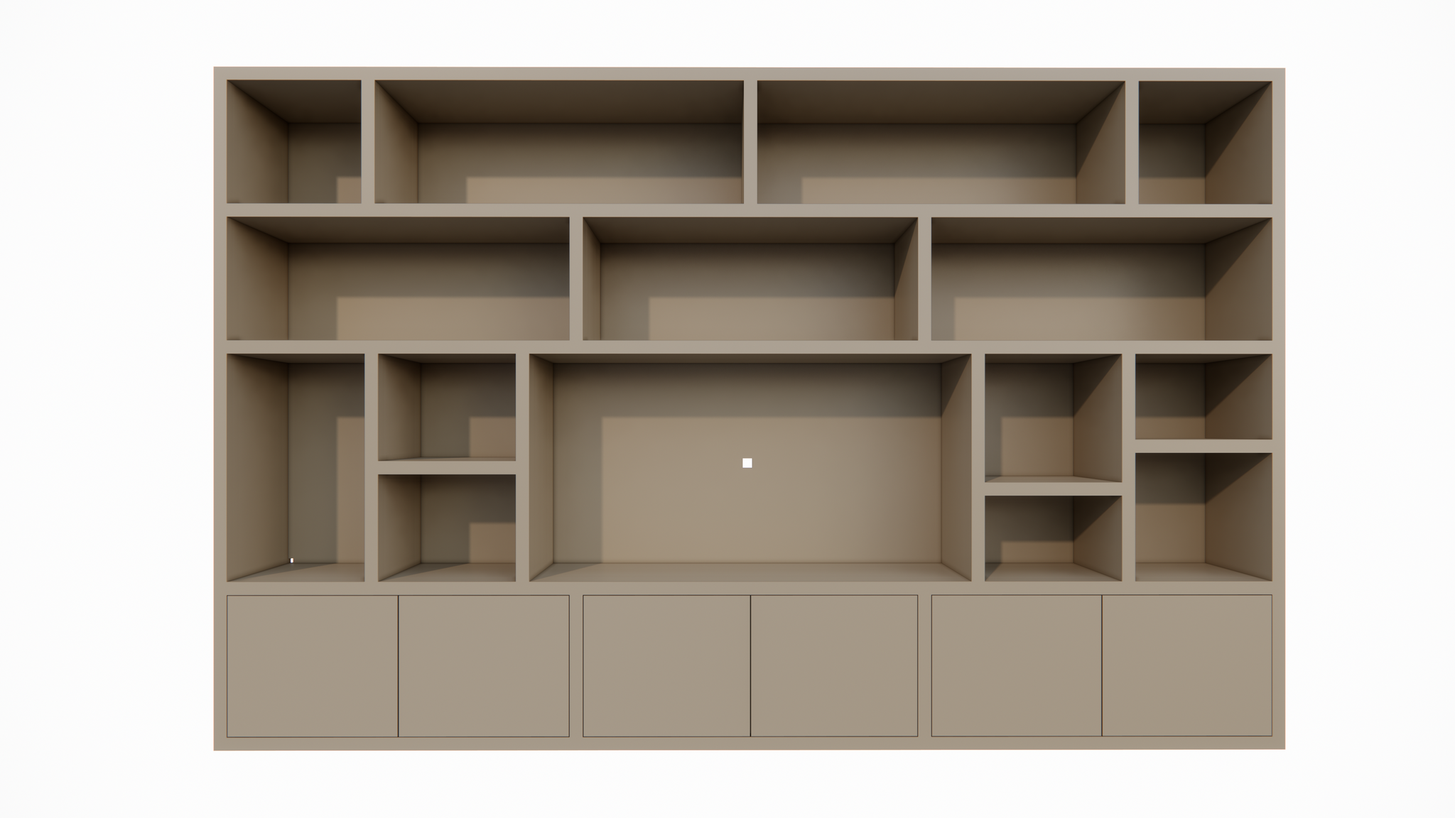 Osaka Fächerschrank - 400x40x255H cm - 15 offene Fächer - 6 push-to-open Türen - Cinewall - TV-Fach - schlankes Design - zerlegbar - 5cm Bodenstärke