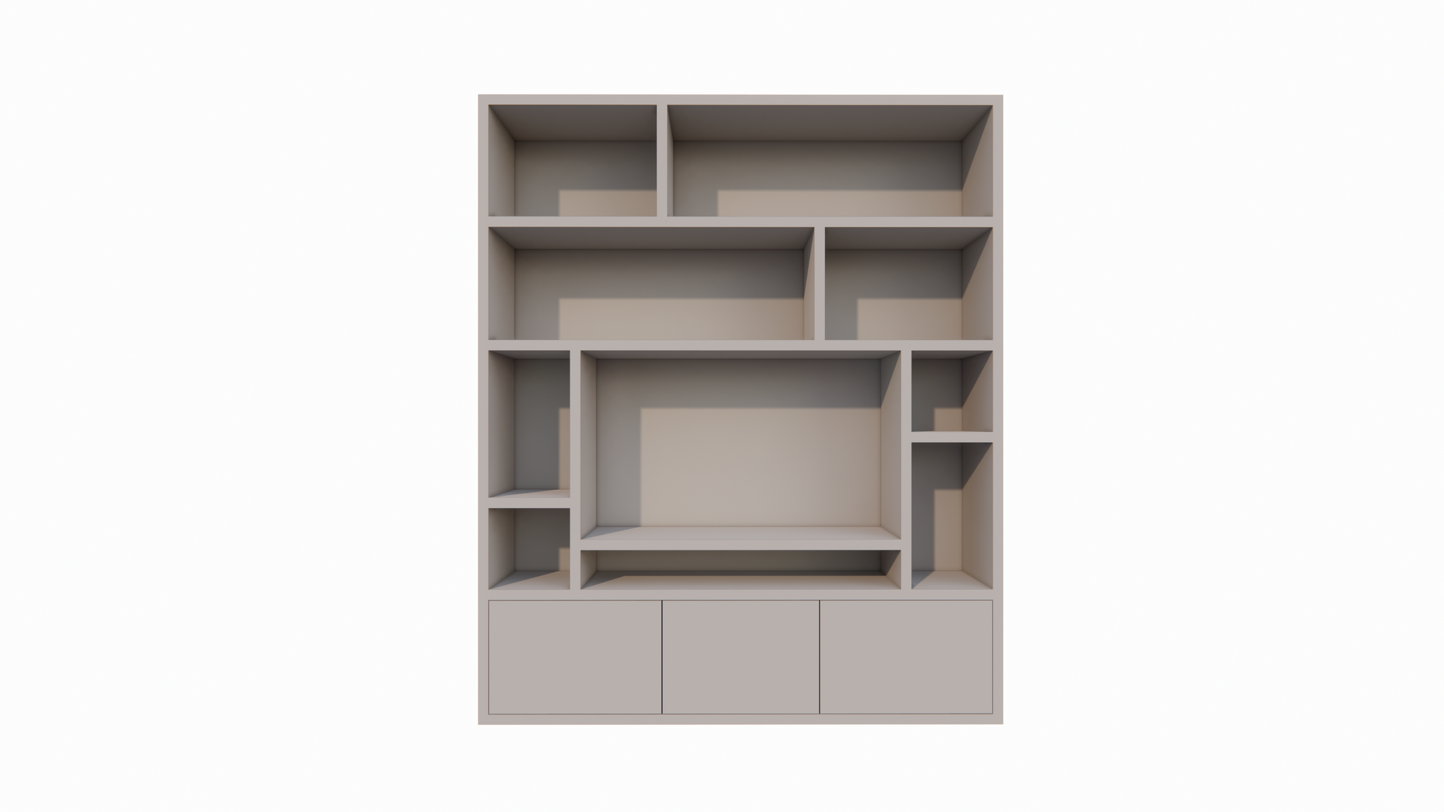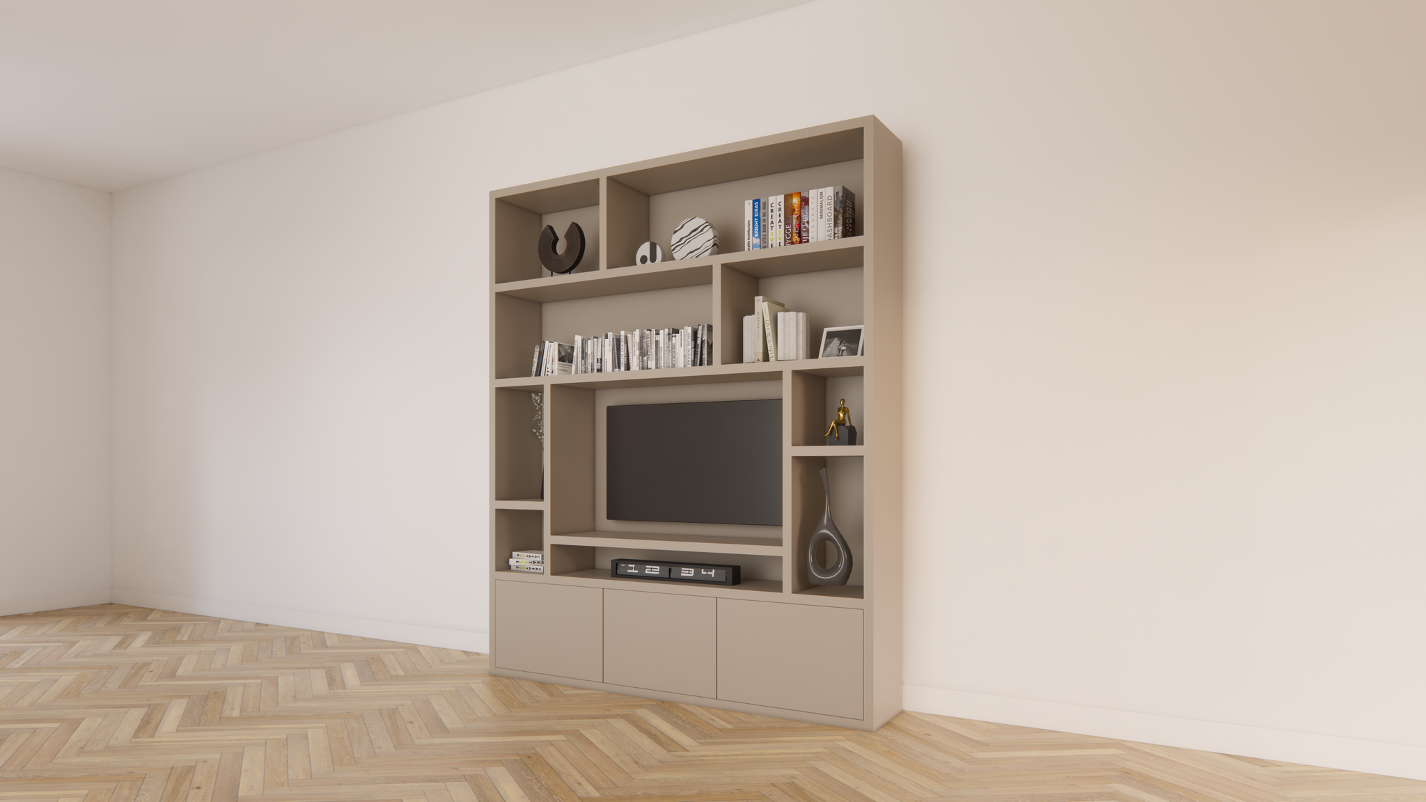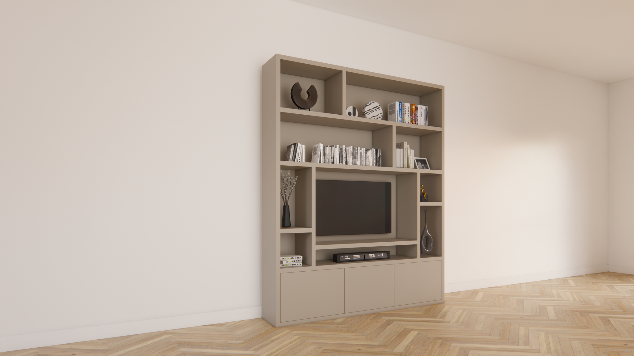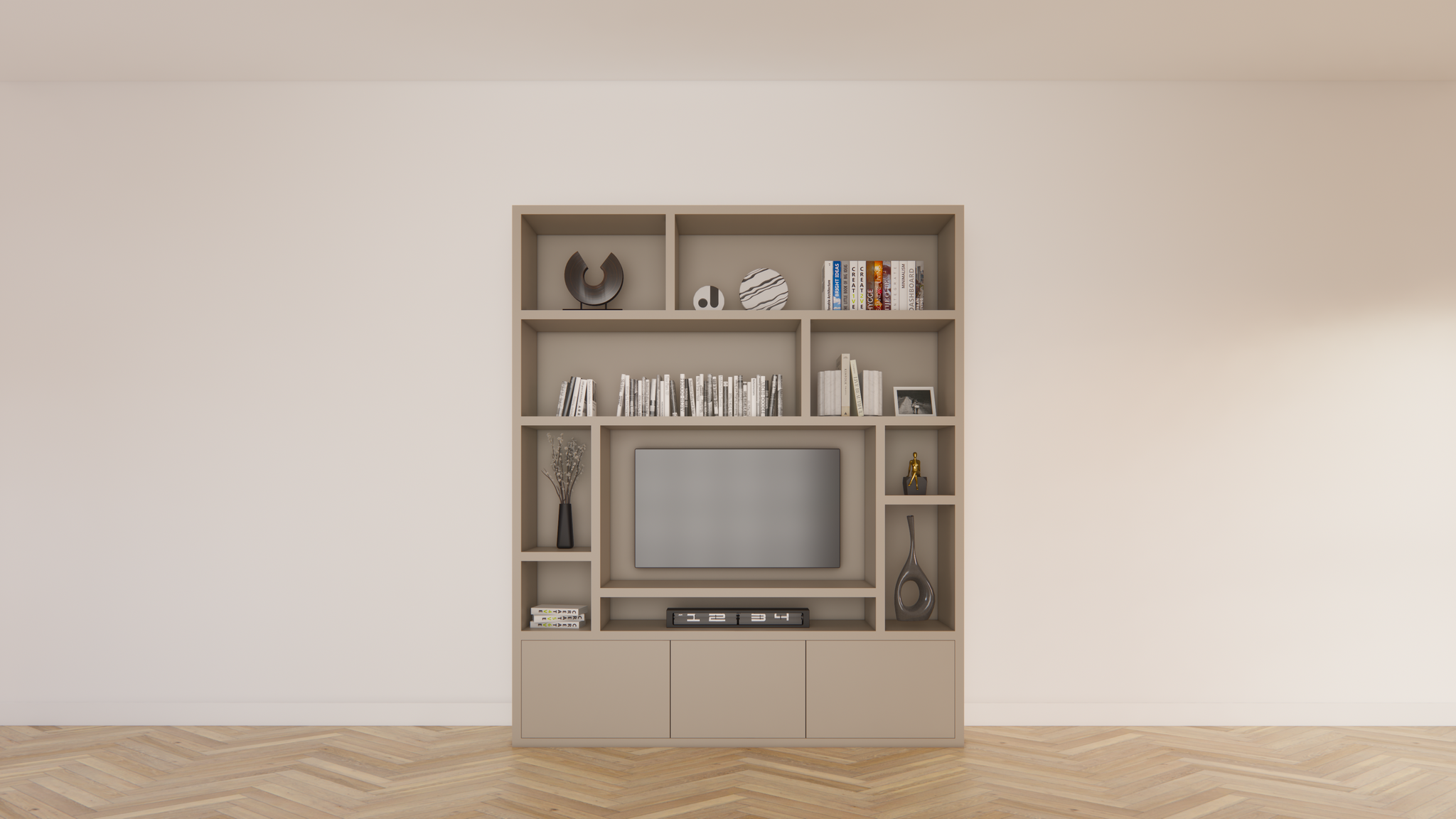 Dieser Schrank hat eine Standardgröße von 200 cm Breite, 35 cm Tiefe und 240 cm Höhe. In der Mitte befindet sich eine geräumige Nische für den Fernseher, schön eingerahmt von offenen Fächern in verschiedenen Größen. Perfekt für die Präsentation von Büchern, Gegenständen oder Dekorationen, wobei der Fernseher dezent in das Gesamtbild integriert wird.