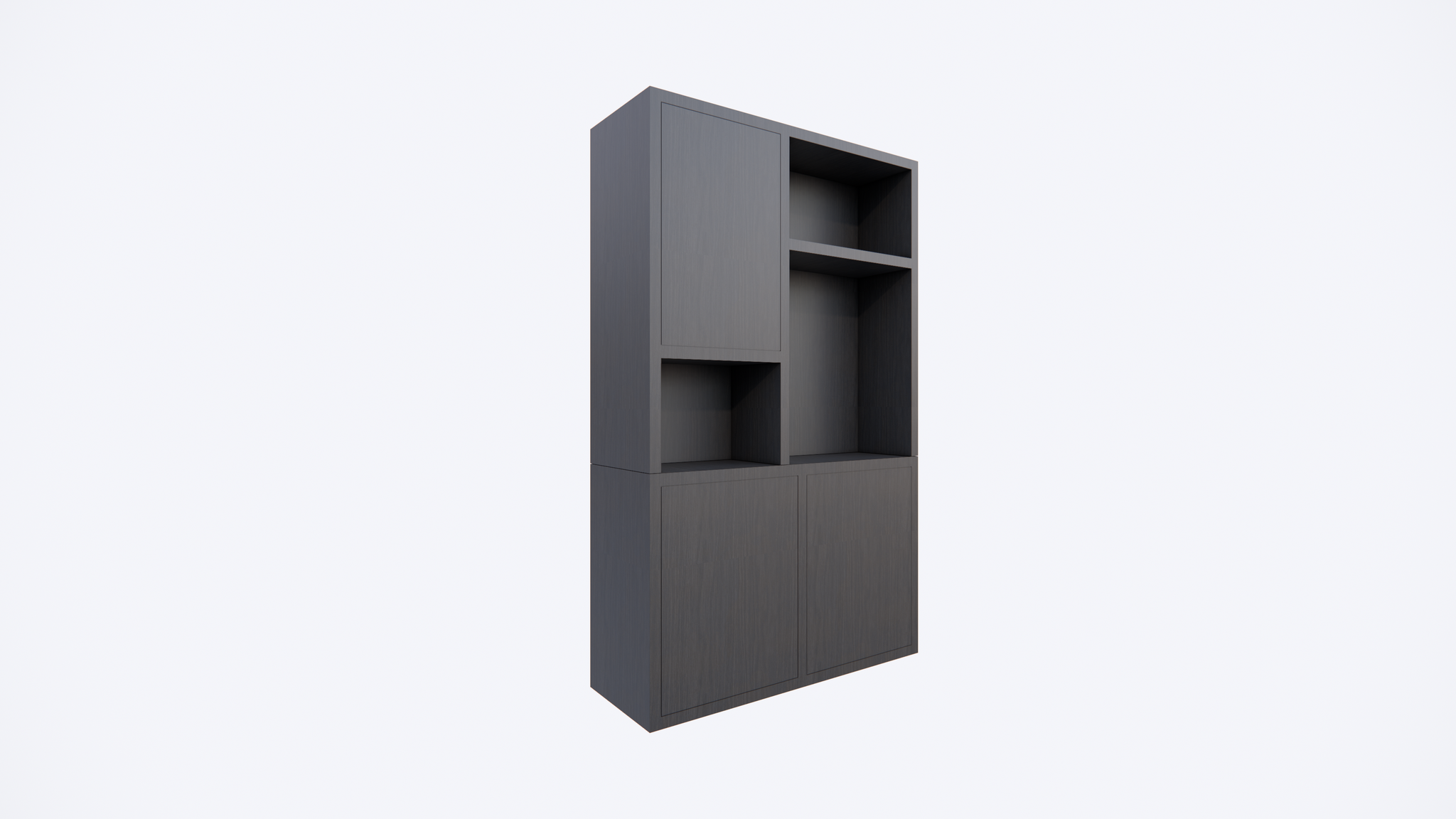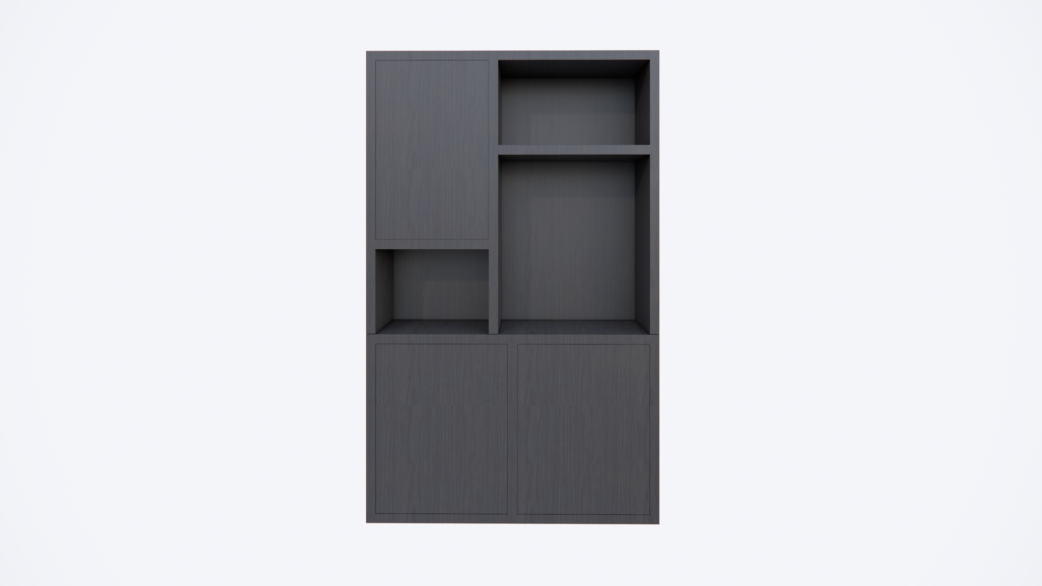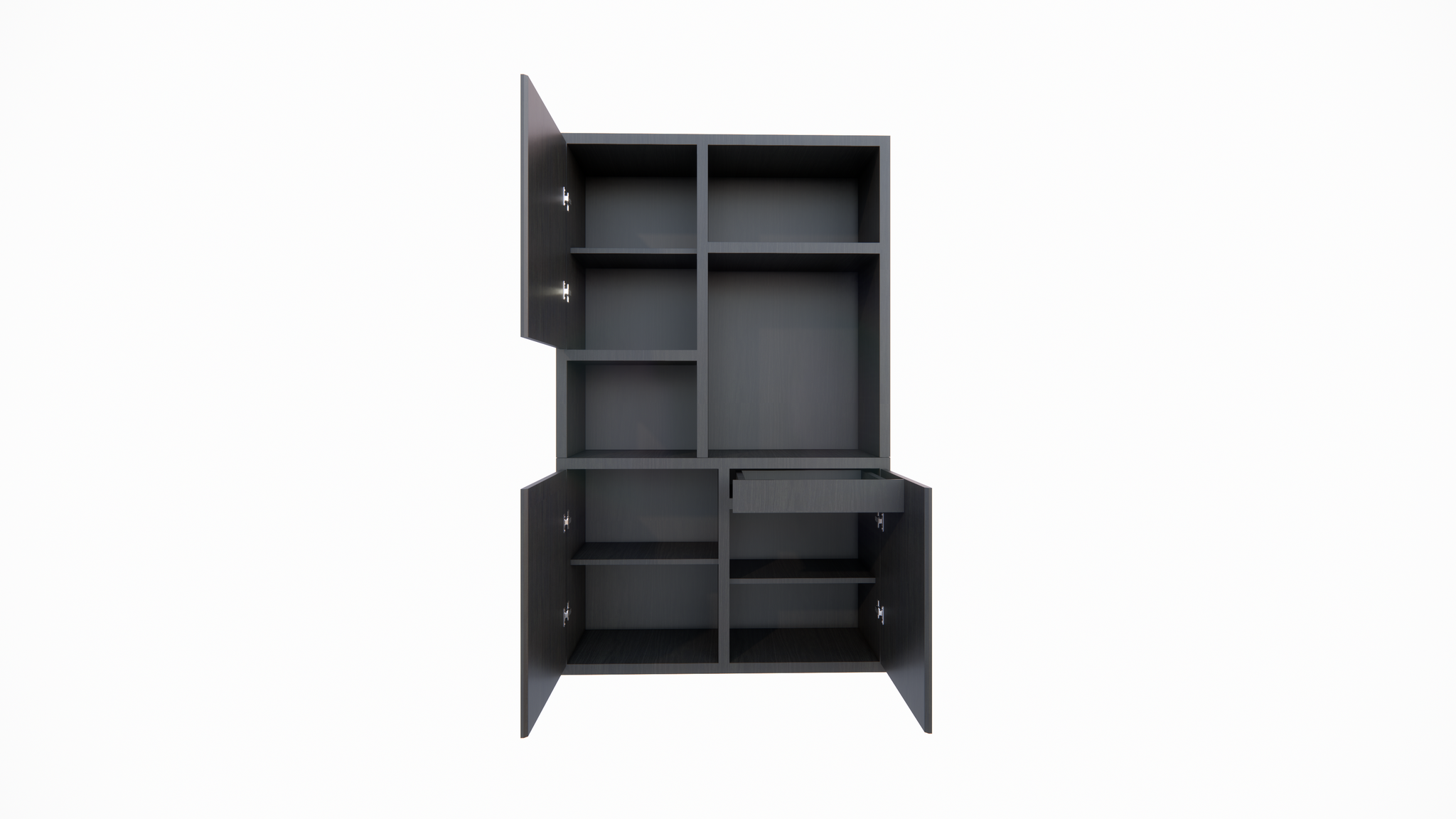 Der Schrank verfügt über eine spielerische Kombination aus offenen Fächern und einer dichten Tür im oberen Schrank, die es Ihnen ermöglicht, zwischen Zeigen und Verstecken abzuwechseln. Hinter einer der Türen befindet sich außerdem eine praktische Schublade, ideal für kleinere Gegenstände. Die Push-to-open-Türen bieten einen eleganten und minimalistischen Look ohne Griffe.