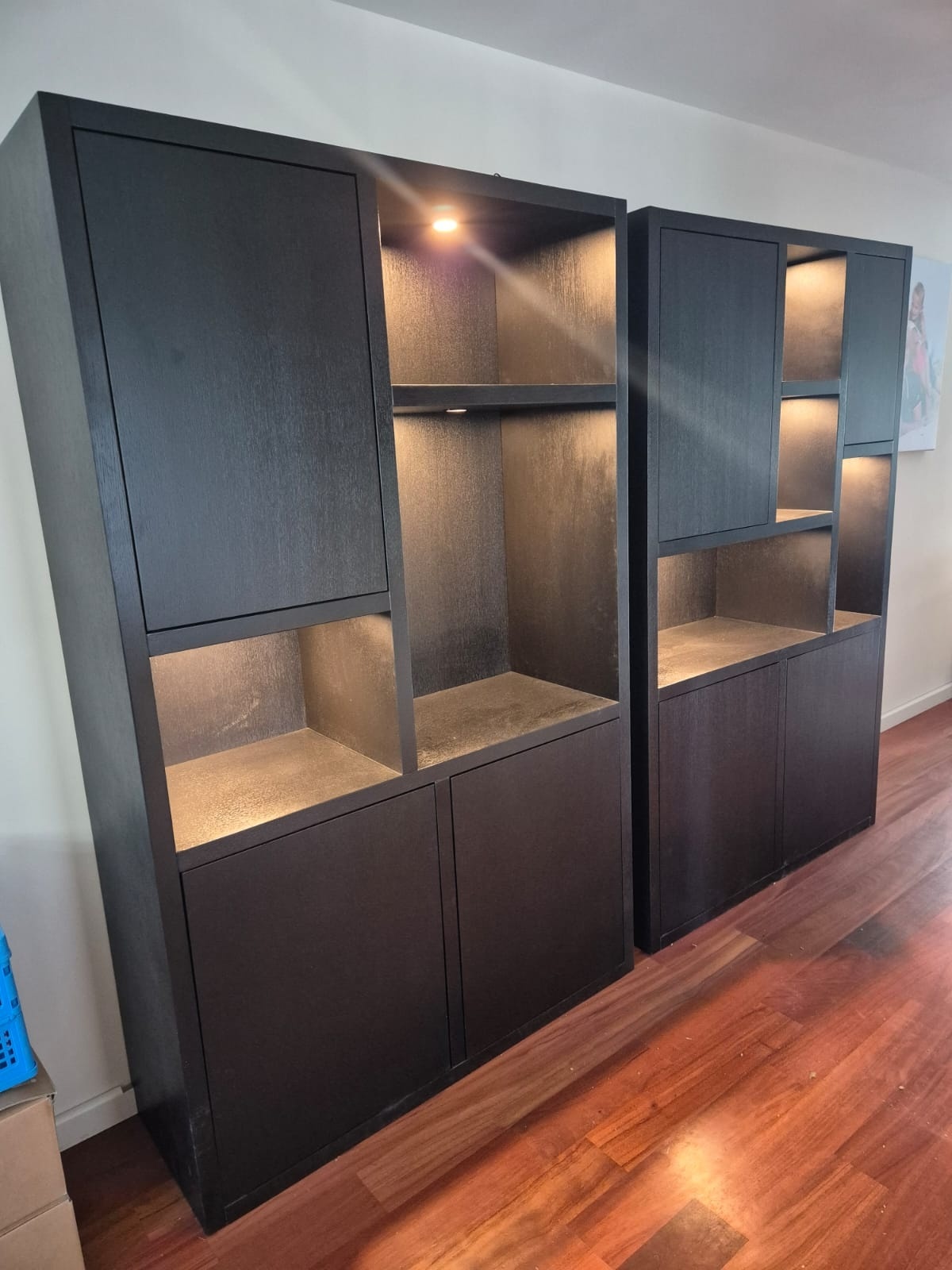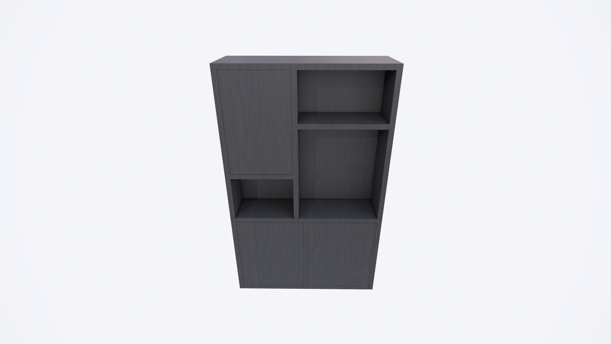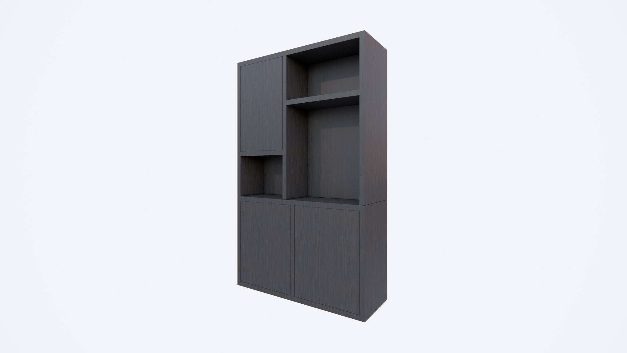 Der Schrank verfügt über eine spielerische Kombination aus offenen Fächern und einer dichten Tür im oberen Schrank, die es Ihnen ermöglicht, zwischen Zeigen und Verstecken abzuwechseln. Hinter einer der Türen befindet sich außerdem eine praktische Schublade, ideal für kleinere Gegenstände. Die Push-to-open-Türen bieten einen eleganten und minimalistischen Look ohne Griffe.
