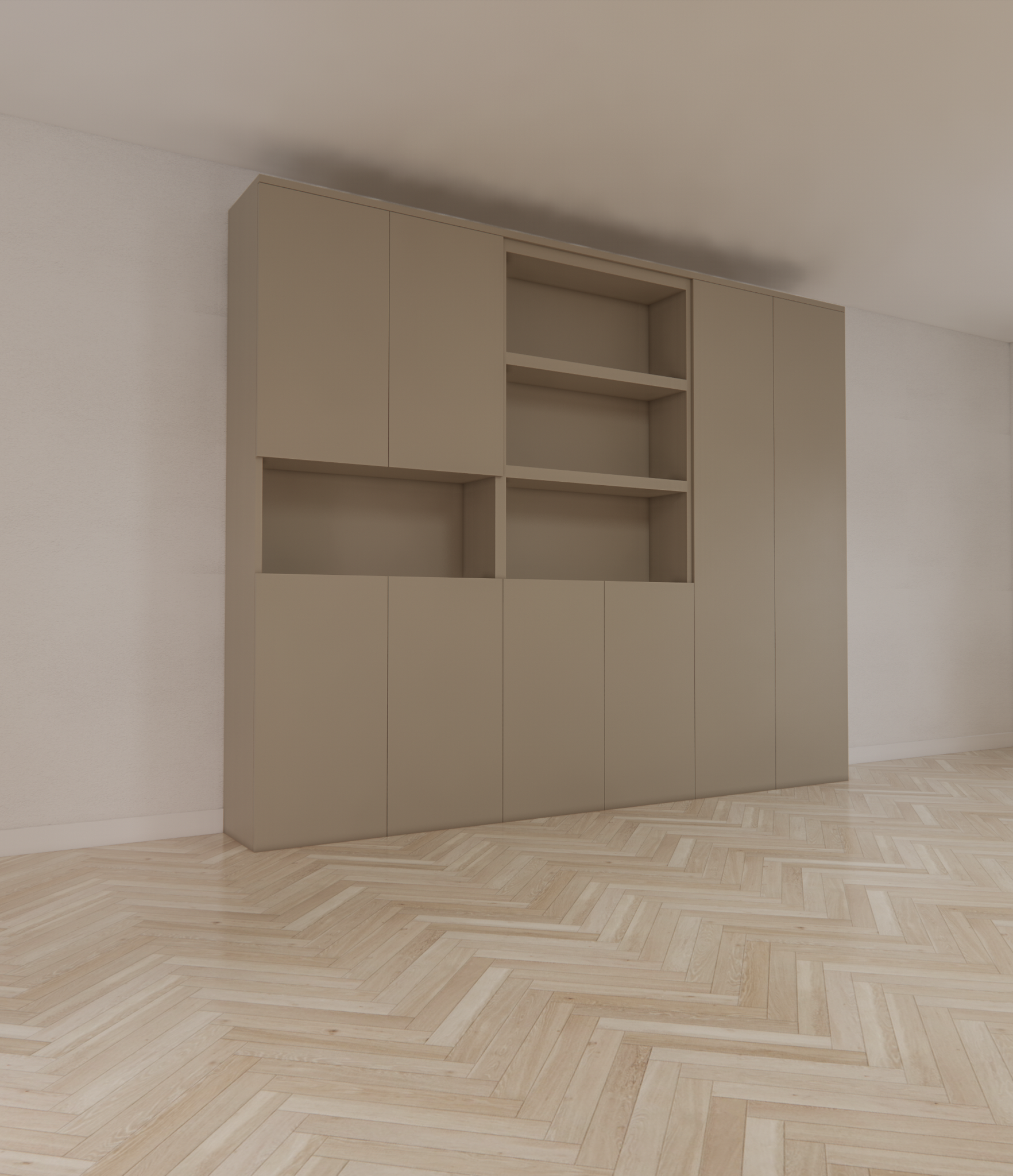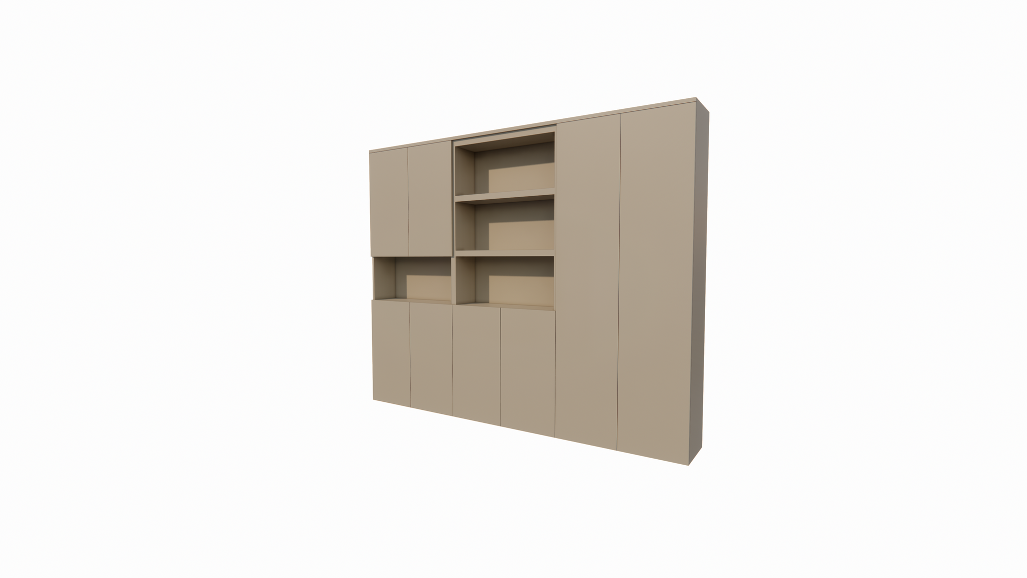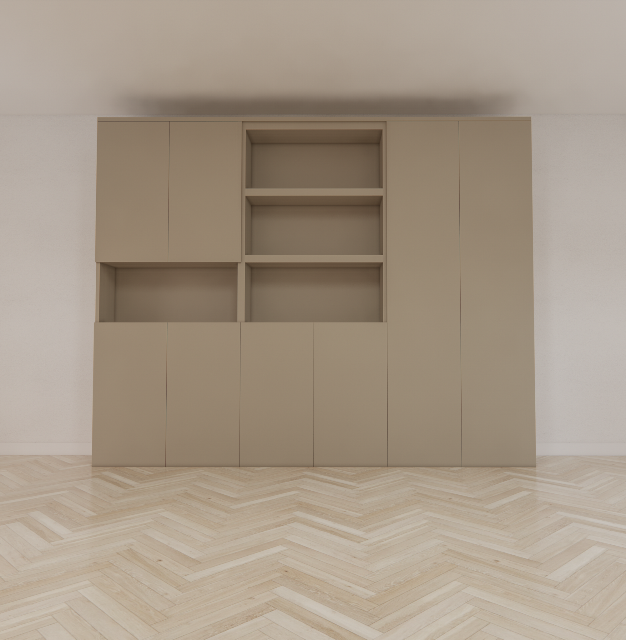 >Ein weiteres auffälliges Merkmal sind die vier offenen Fächer, die ideal sind, um Ihre schönsten Dekorationsstücke, Bücher, Pflanzen oder andere persönliche Gegenstände auszustellen. Diese offenen Fächer bieten eine spielerische Abwechslung zum geschlossenen Teil des Schranks und tragen zu einem dynamischen Look bei, während sie gleichzeitig praktischen Stauraum bieten.