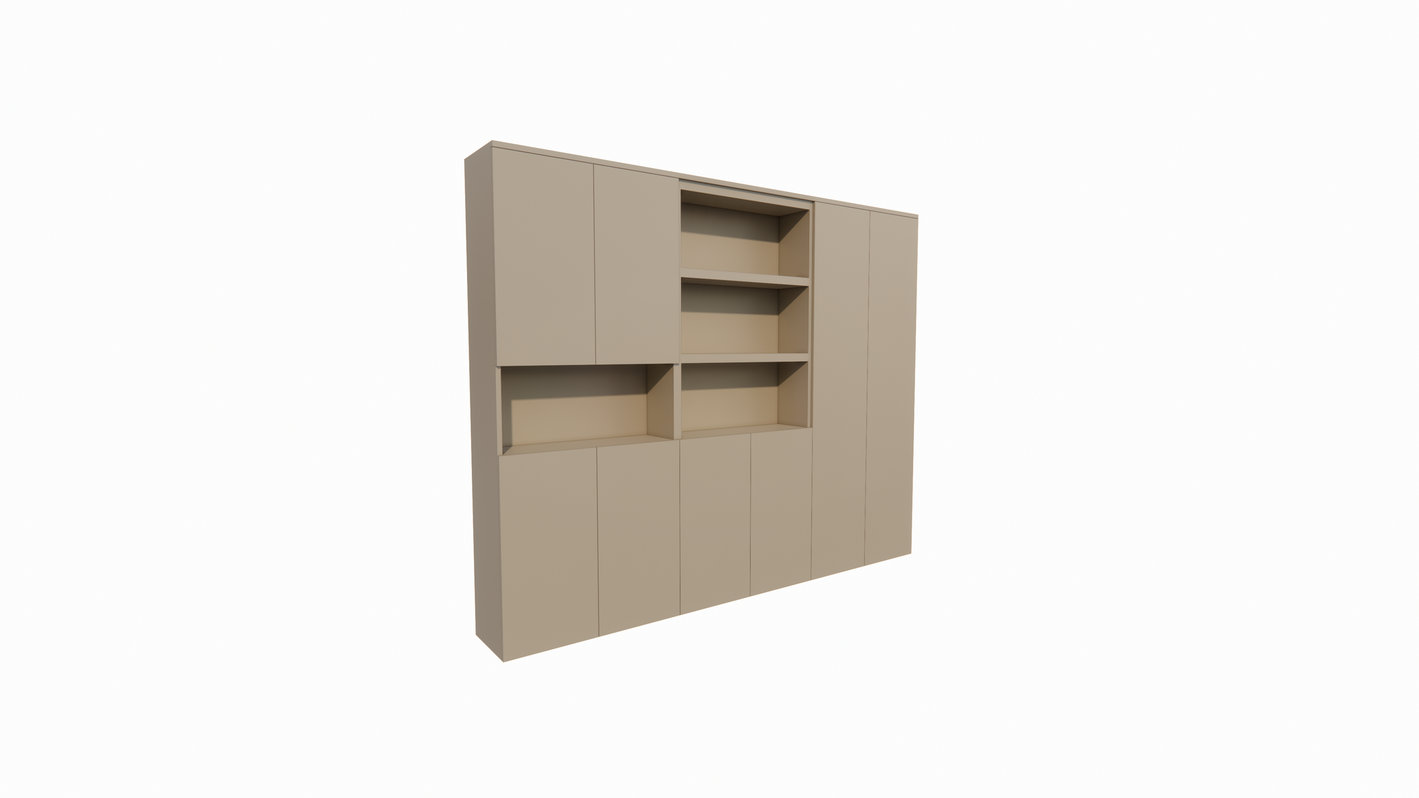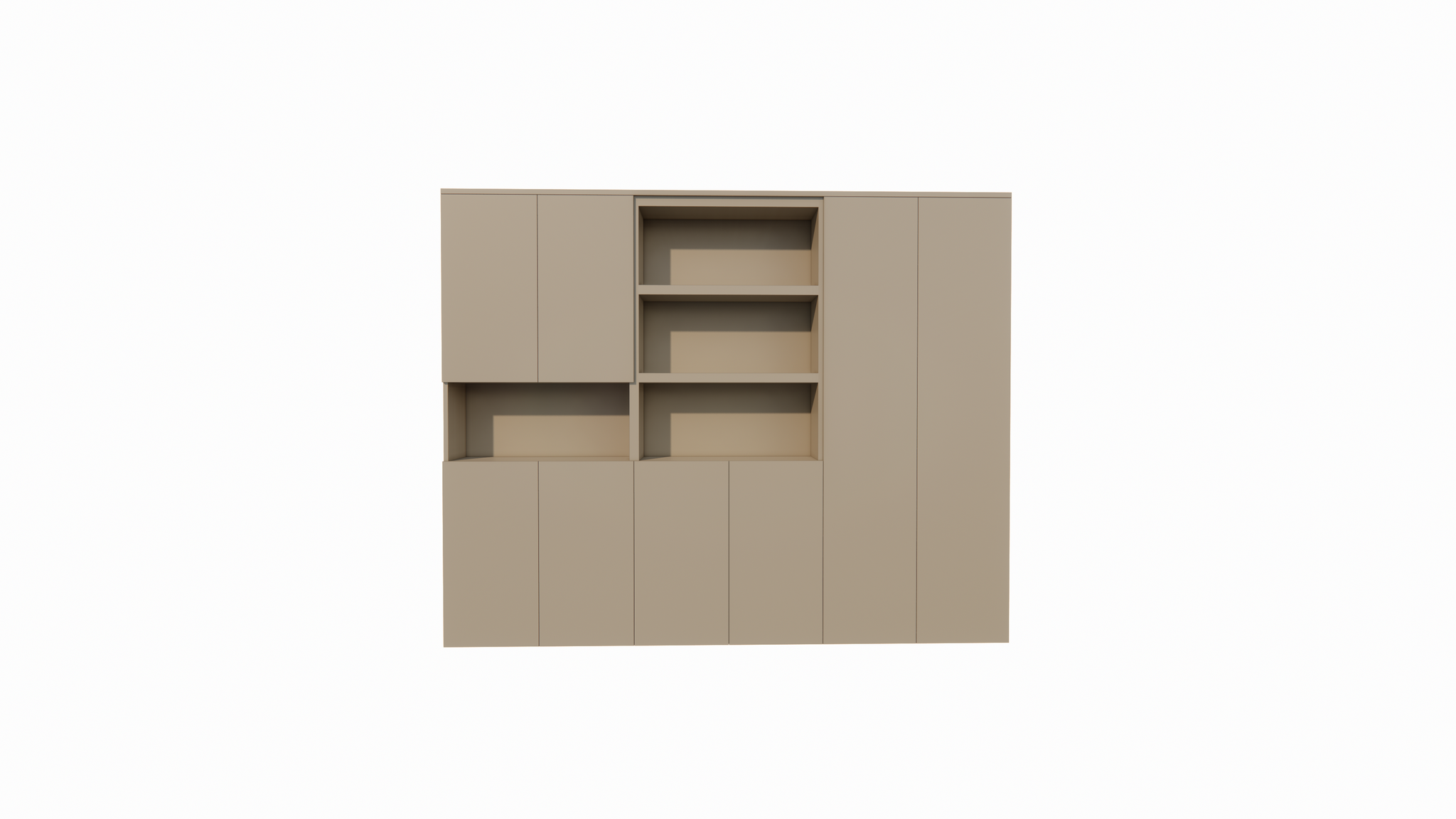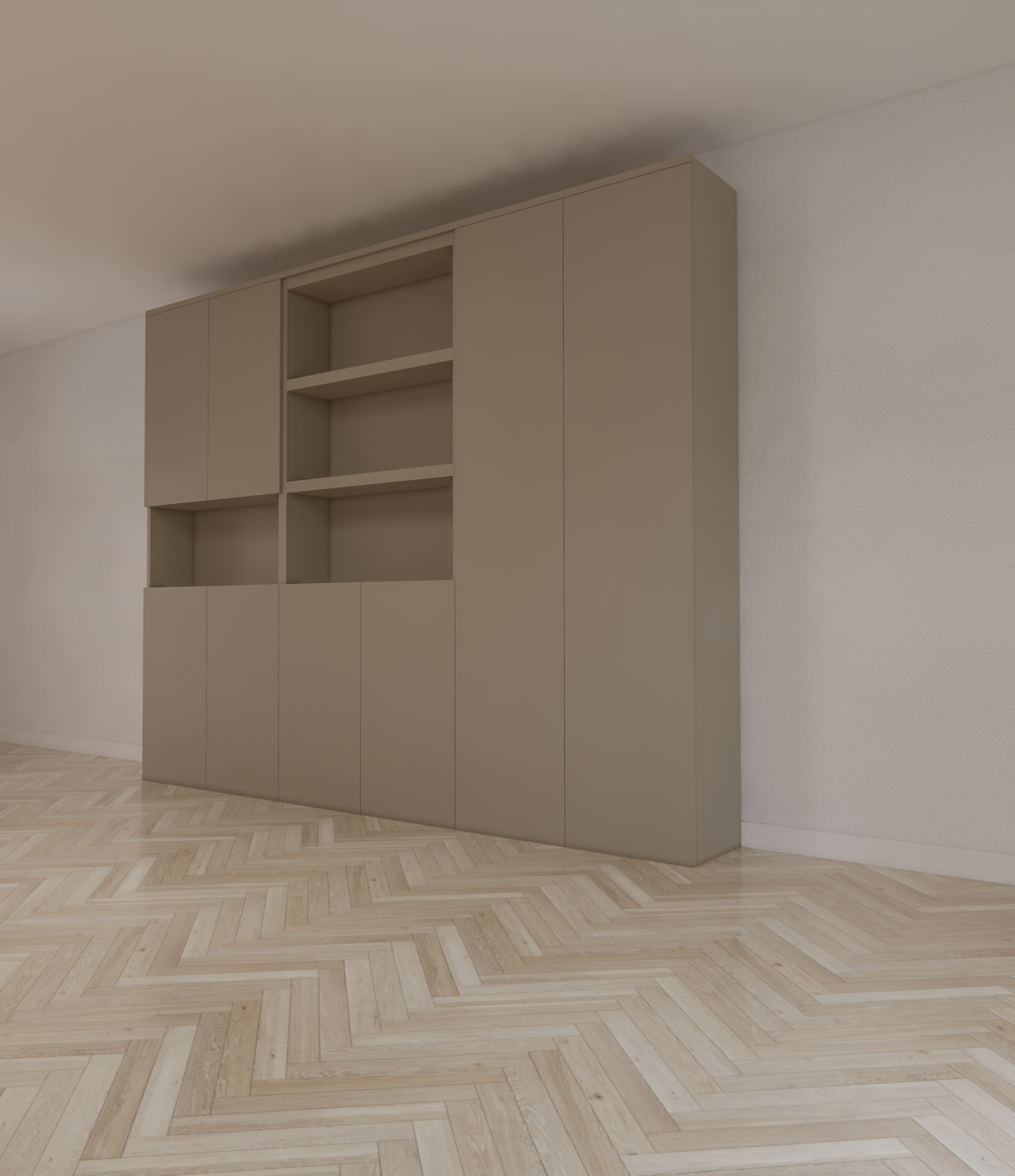 >Ein weiteres auffälliges Merkmal sind die vier offenen Fächer, die ideal sind, um Ihre schönsten Dekorationsstücke, Bücher, Pflanzen oder andere persönliche Gegenstände auszustellen. Diese offenen Fächer bieten eine spielerische Abwechslung zum geschlossenen Teil des Schranks und tragen zu einem dynamischen Look bei, während sie gleichzeitig praktischen Stauraum bieten.