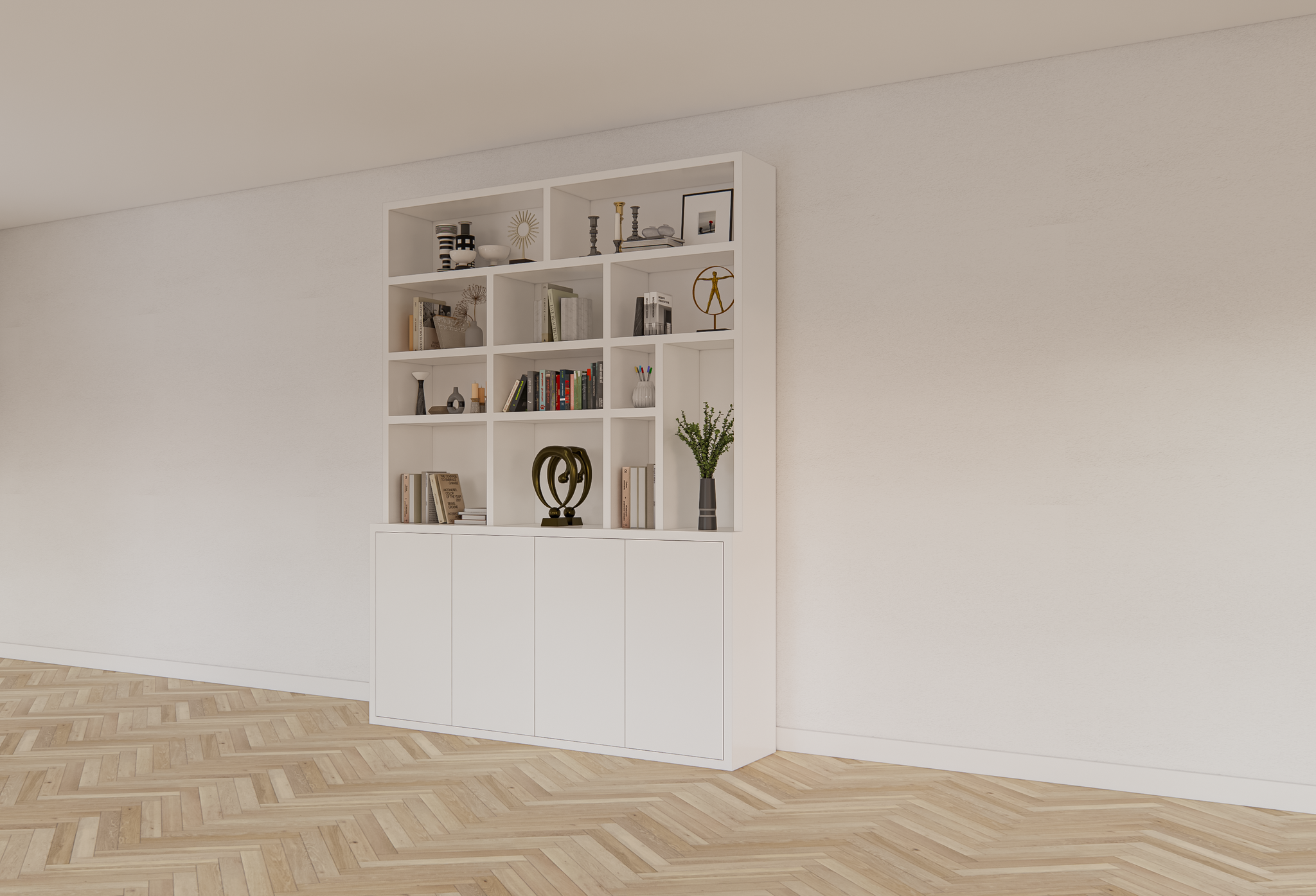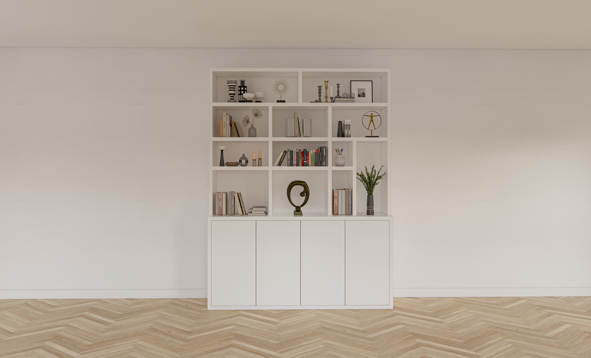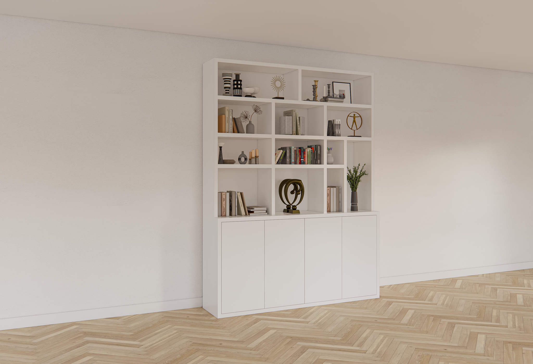 Die offenen Fächer schaffen eine spielerische und luftige Anordnung, in der Sie alle Ihre Lieblingsbücher, Accessoires oder Kunstobjekte schön präsentieren können. Der Boden des Schranks ist mit Push-to-Open-Türen ausgestattet, die einen eleganten und grifflosen Look sowie genügend Stauraum bieten, um die Dinge ordentlich zu verstauen.