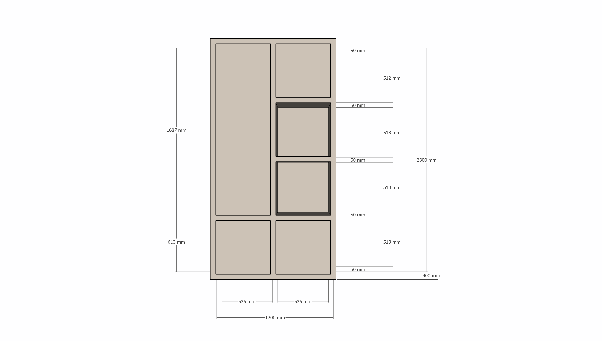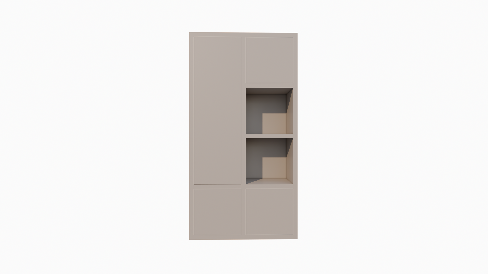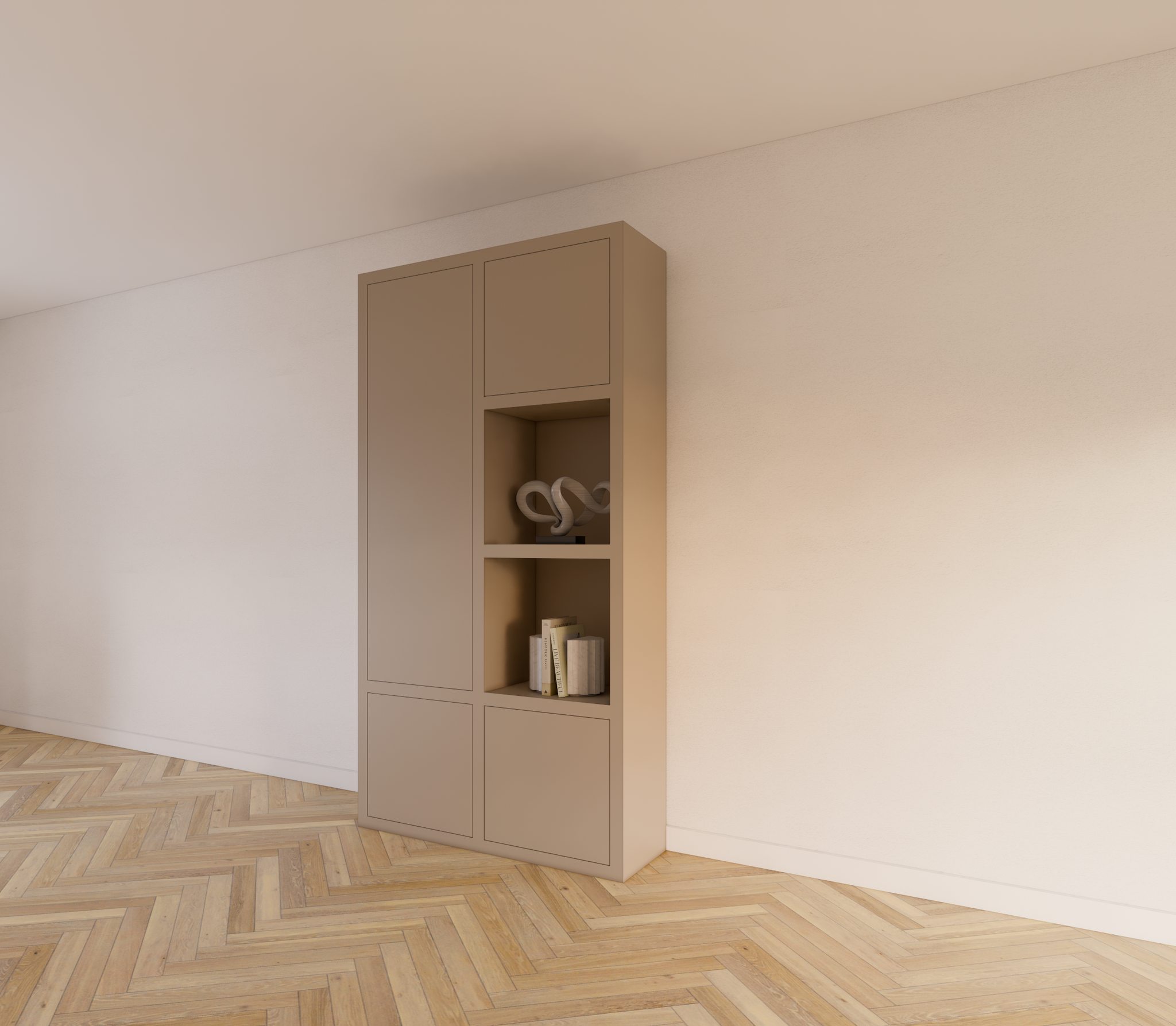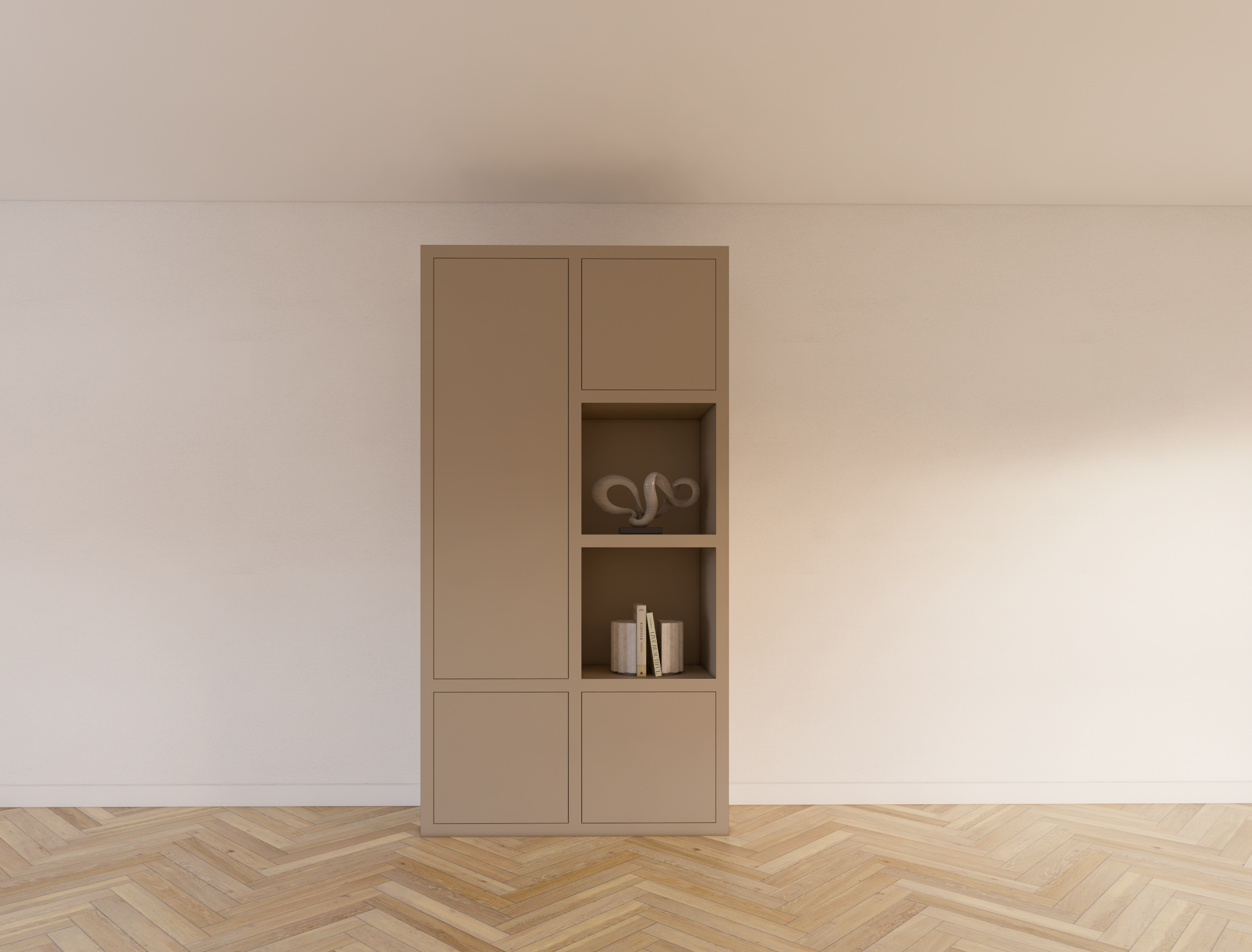 >Auffallendes Detail sind die Einlegeböden mit einer Stärke von 5 cm. Diese verleihen dem Schrank zusätzlichen Körper und sorgen für eine hochwertige, solide Optik. Die abgebildete Version ist in der Farbe NCS S 2005-Y50R, einem sanften, warmen Beigeton, der gut zu hellen Einrichtungen passt.
