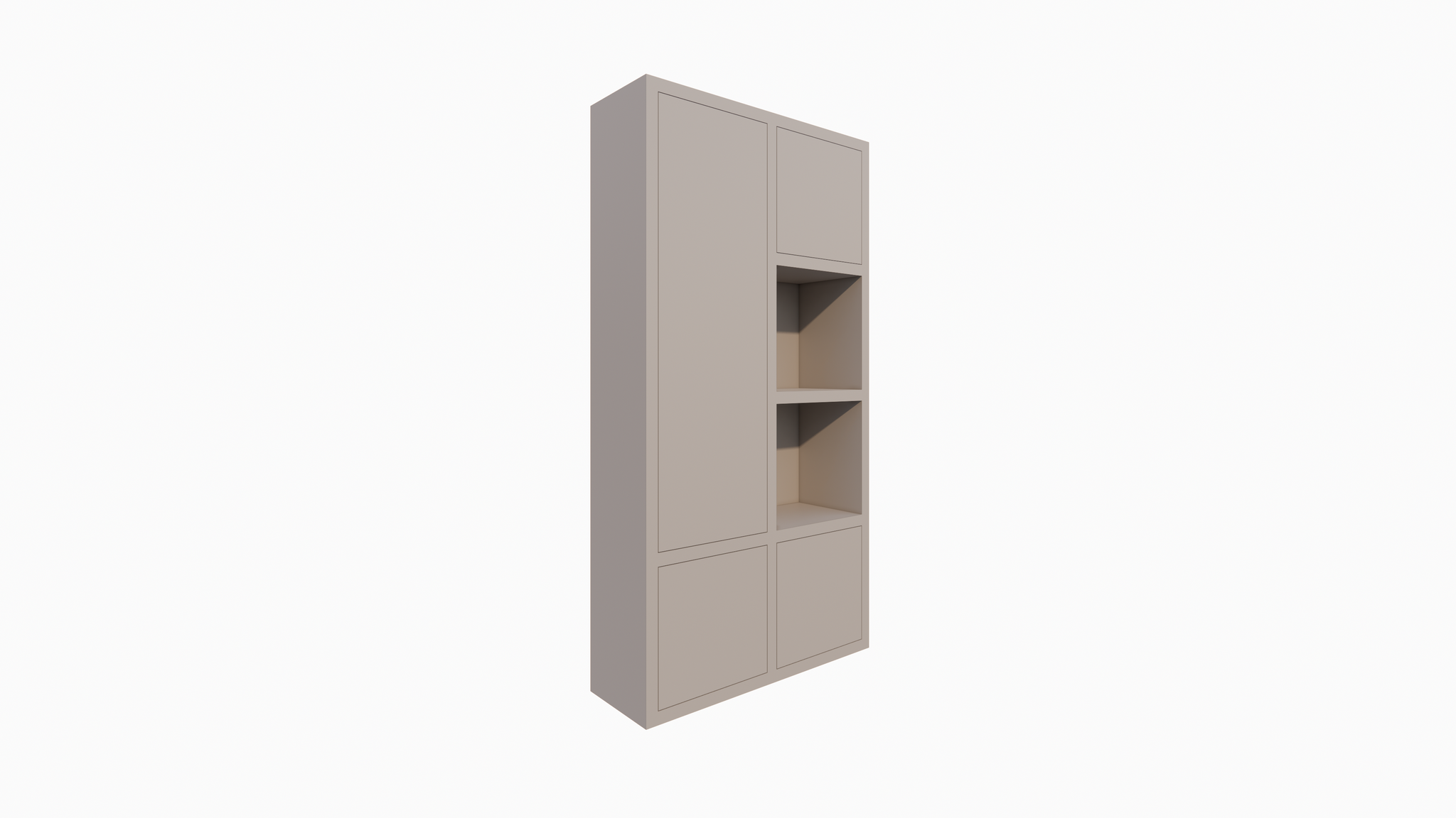 >Der Schrank ist mit grifflosen Push-to-Open-Türen ausgestattet, die für einen eleganten und gleichmäßigen Look sorgen. Die offenen Fächer in der Mitte bieten Platz für Bücher, Dekoration oder persönliche Gegenstände. Die Kombination aus geschlossenen und offenen Fächern hält das Möbel optisch interessant und dennoch ruhig.