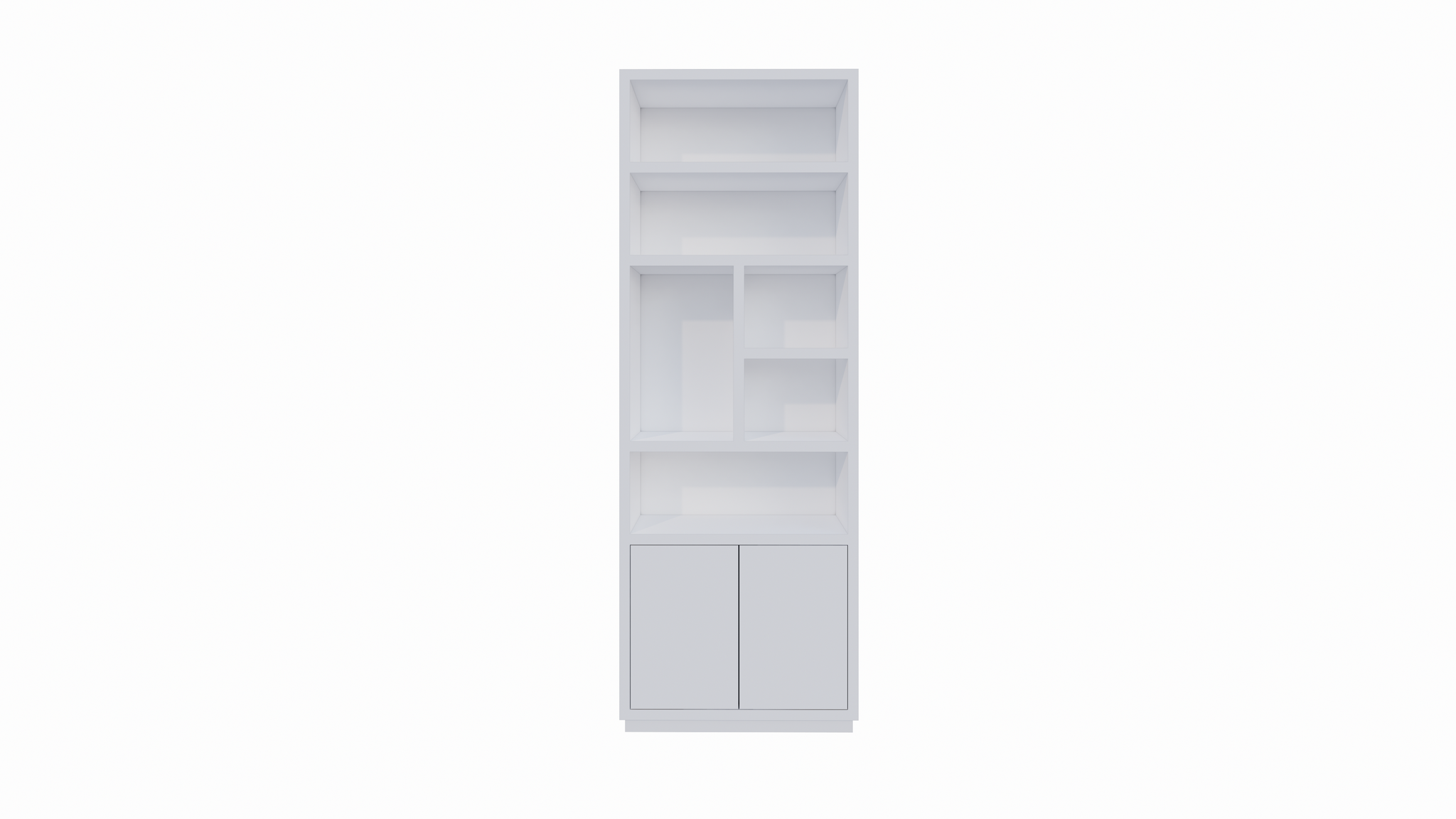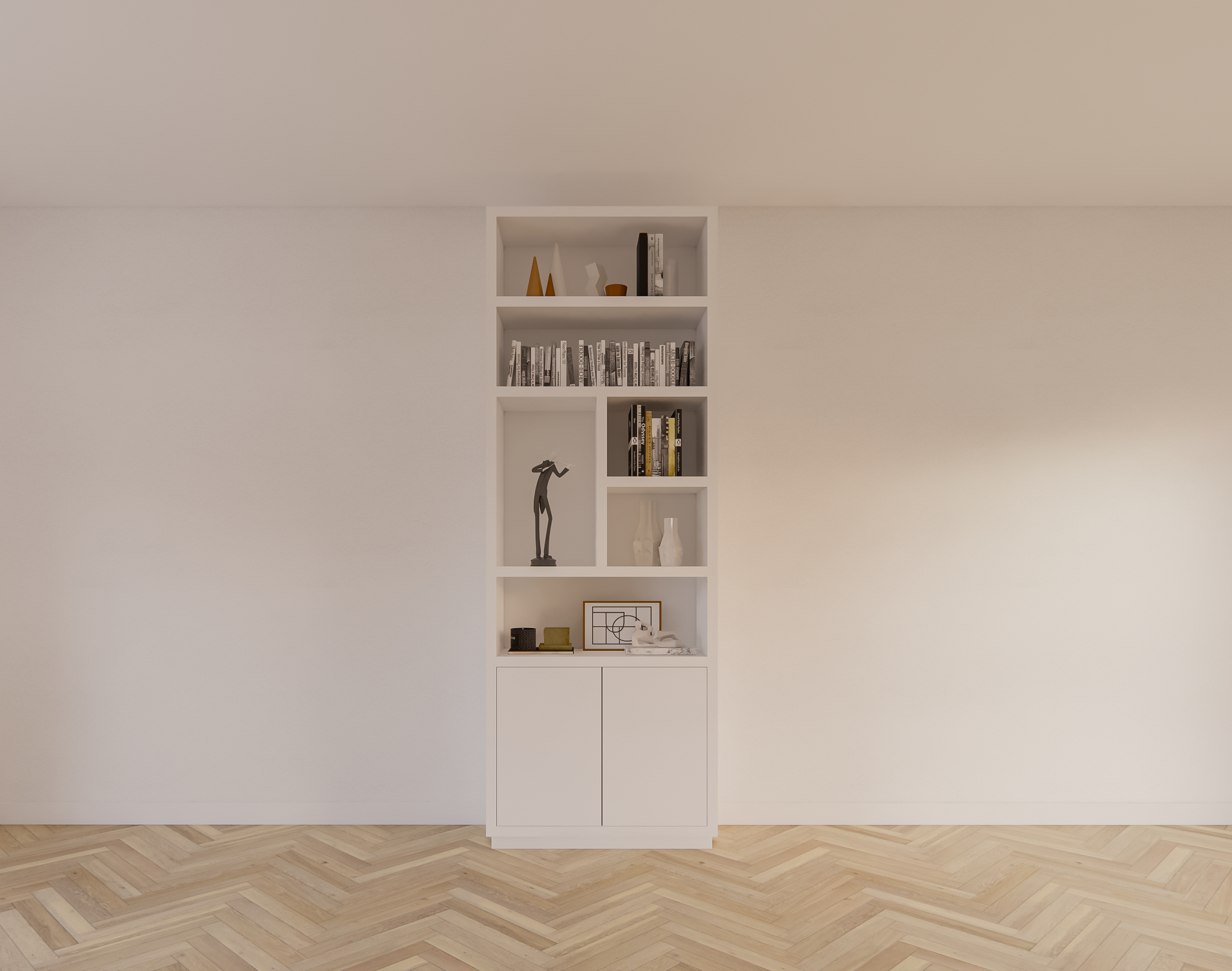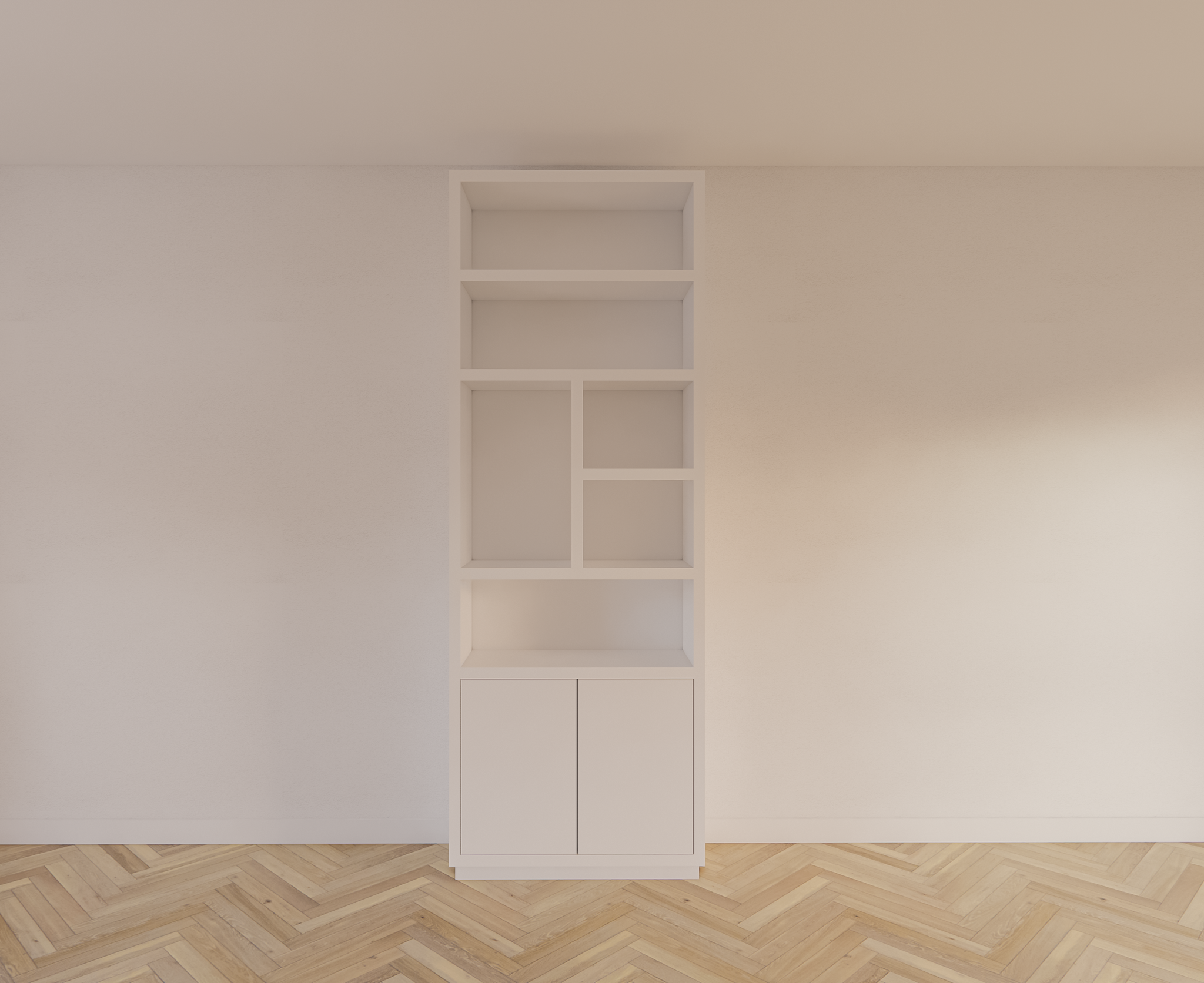 Der Schrank kombiniert offene Fächer für Bücher, Dekoration oder persönliche Gegenstände mit einem geschlossenen Unterschrank mit Push-to-Open-Türen. Das grifflose Design verleiht dem Schrank ein schlichtes und ruhiges Aussehen, ohne abzulenken. Die Aufteilung der offenen Fächer ist spielerisch, aber ausgewogen und macht das Möbelstück nicht nur funktional, sondern auch optisch interessant.