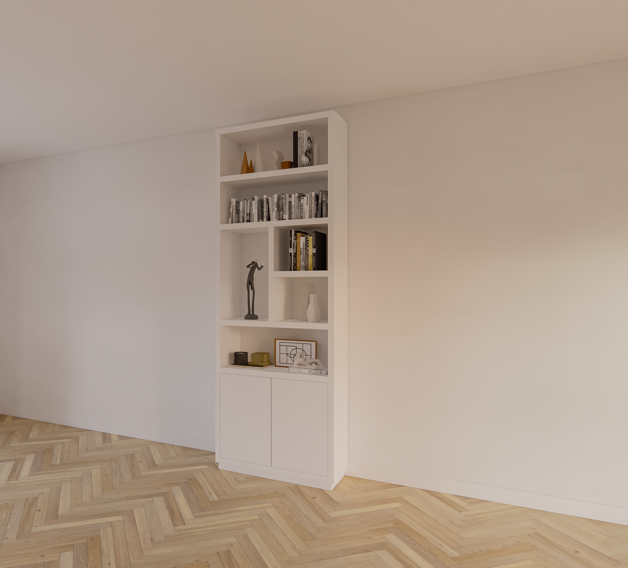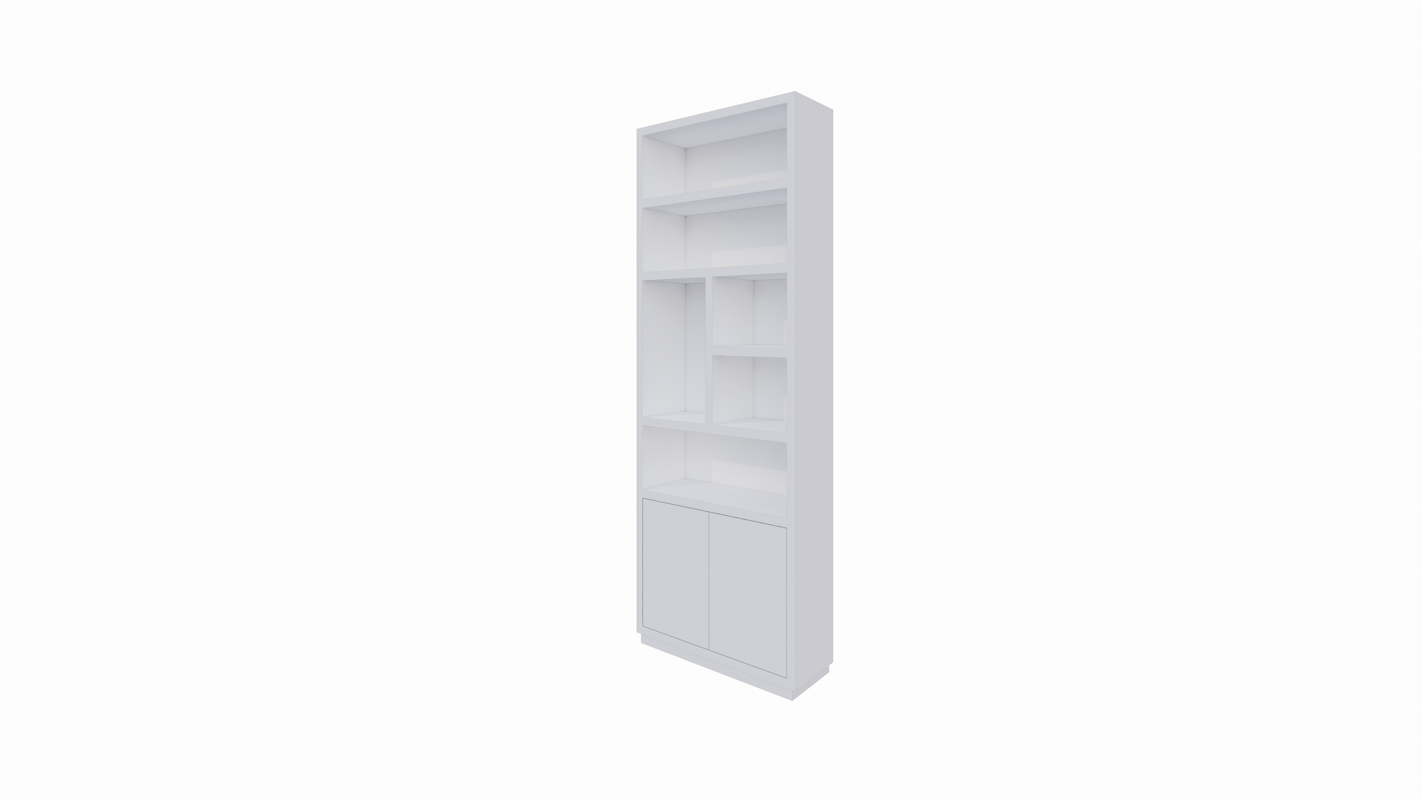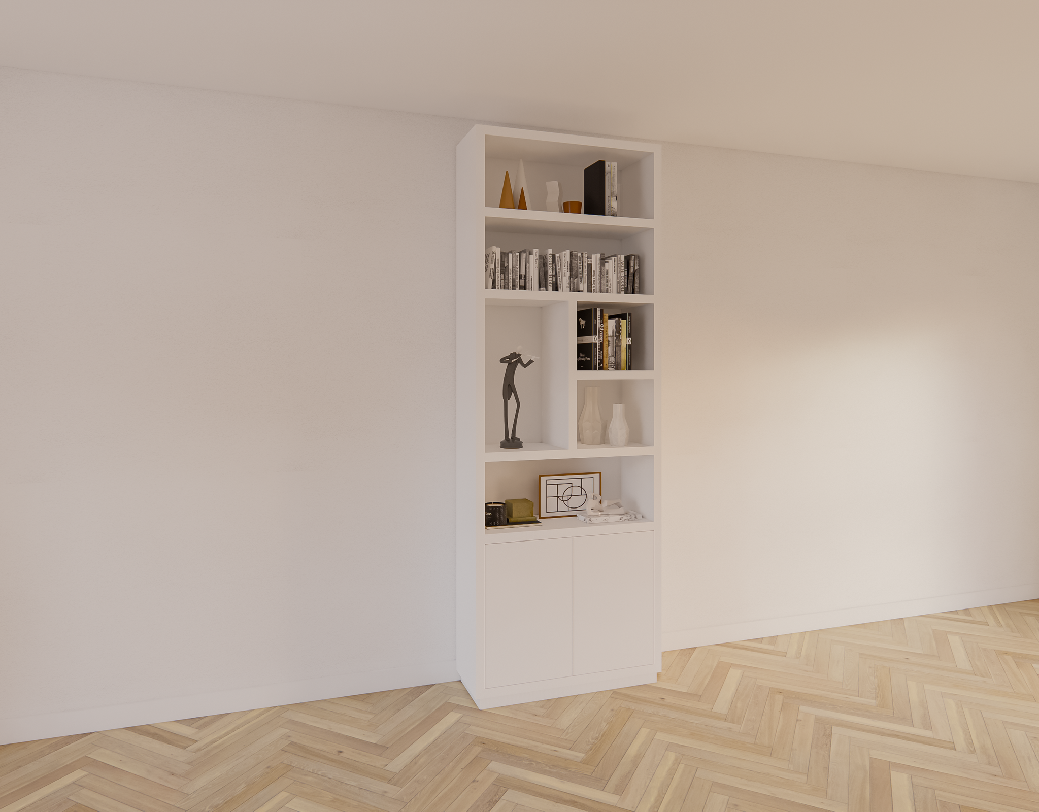 Der Schrank kombiniert offene Fächer für Bücher, Dekoration oder persönliche Gegenstände mit einem geschlossenen Unterschrank mit Push-to-Open-Türen. Das grifflose Design verleiht dem Schrank ein schlichtes und ruhiges Aussehen, ohne abzulenken. Die Aufteilung der offenen Fächer ist spielerisch, aber ausgewogen und macht das Möbelstück nicht nur funktional, sondern auch optisch interessant.